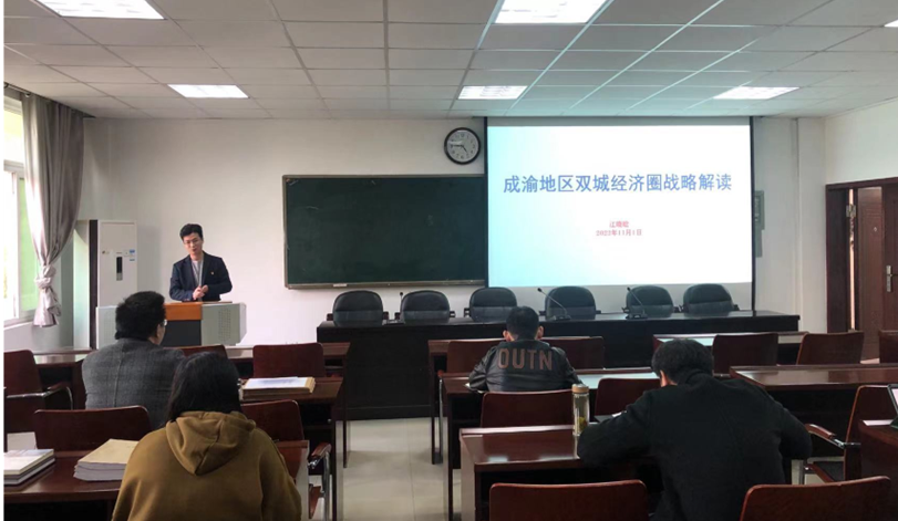 11月1日下午,bevictor1946韦德官网第三期“景明论坛”在经管楼401成功举办。bevictor1946韦德官网副经理江晓晗作了题为“成渝地区双城经济圈战略解读”的学术报告,bevictor1946韦德官网部分师生聆听了报告。