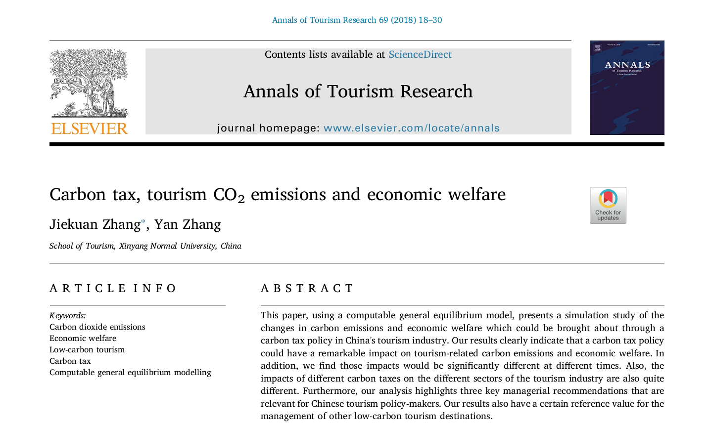 近日,国际旅游学科顶级权威期刊《Annals of Tourism Research》刊登了公司章杰宽博士的研究论文《Carbon tax, tourism CO2emissions and economic welfare》(Volume 69, 2018, Pages 18–30)。《Annals of Tourism Research》是国际公认的最顶尖的旅游学术期刊,代表着国际旅游学术研究的最高水平,在国际旅游研究领域享有崇高的声誉。在中科院SSCI分区中,该刊属于管理学大类的一区期刊。