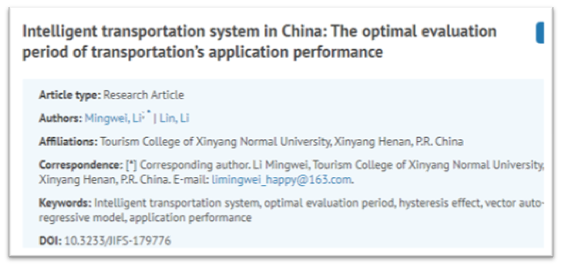 近日,bevictor1946韦德官网李明伟博士在SCI期刊《Journal of Intelligent and Fuzzy System》期刊上发表题为“Intelligent Transportation System in China: the Optimal Evaluation Period of Transportation’s Application Performance”的学术论文。