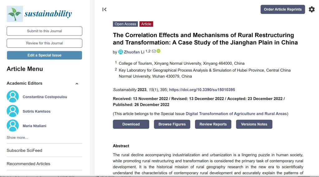 bevictor1946韦德官网李卓凡博士在SSCI期刊《sustainability》(2022年影响因子:3.889)上发表题为“The Correlation Effects and Mechanisms of Rural Restructuring and Transformation: A Case Study of the Jianghan Plain in China”的学术论文。