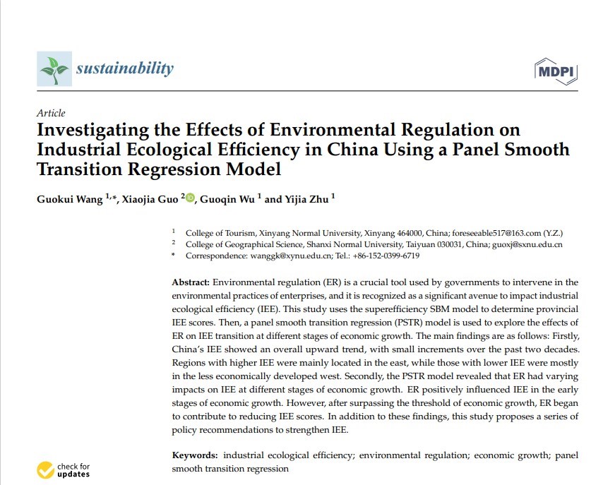 bevictor1946韦德官网王国奎博士在SSCI期刊《sustainability》上发表题为“Investigating the Effects of Environmental Regulation on Industrial Ecological Efficiency in China Using a Panel Smooth Transition Regression Model”的学术论文。