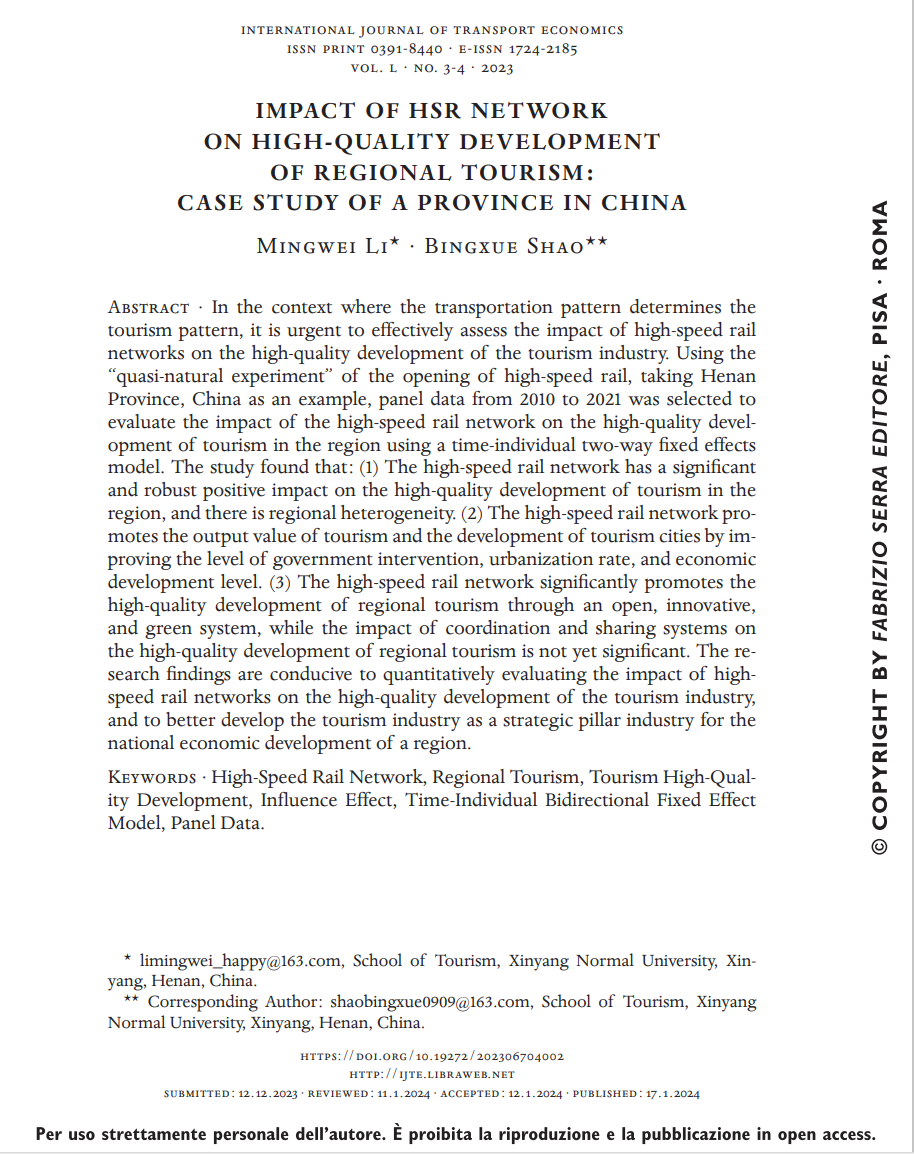 近日,bevictor1946韦德官网李明伟博士在SSCI期刊《International Journal of Transport Economics》发表题为“Impact of HSR Network on High-Quality Development of Regional Tourism: Case Study of a Province in China”(DOI: 10.19272/202306704002)的学术论文。