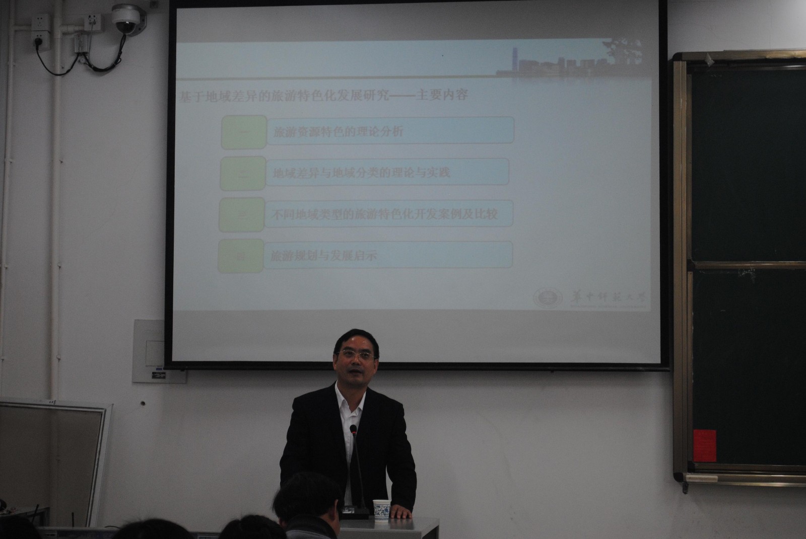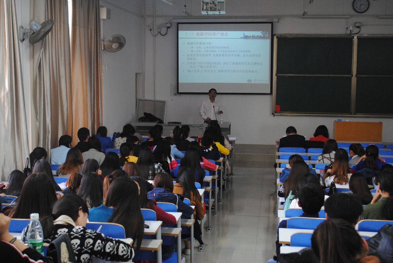 2015年10月23日下午,应工商管理公司邀请,华中师范大学教授、博士生导师罗静来公司讲学,在社科楼415室作了题为“基于地域差异的旅游资源特色化发展模式”的学术报告。工商管理公司部分教师及200余名旅游管理专业本科生和研究生聆听了报告。报告会由工商管理公司副经理彭荣胜教授主持。