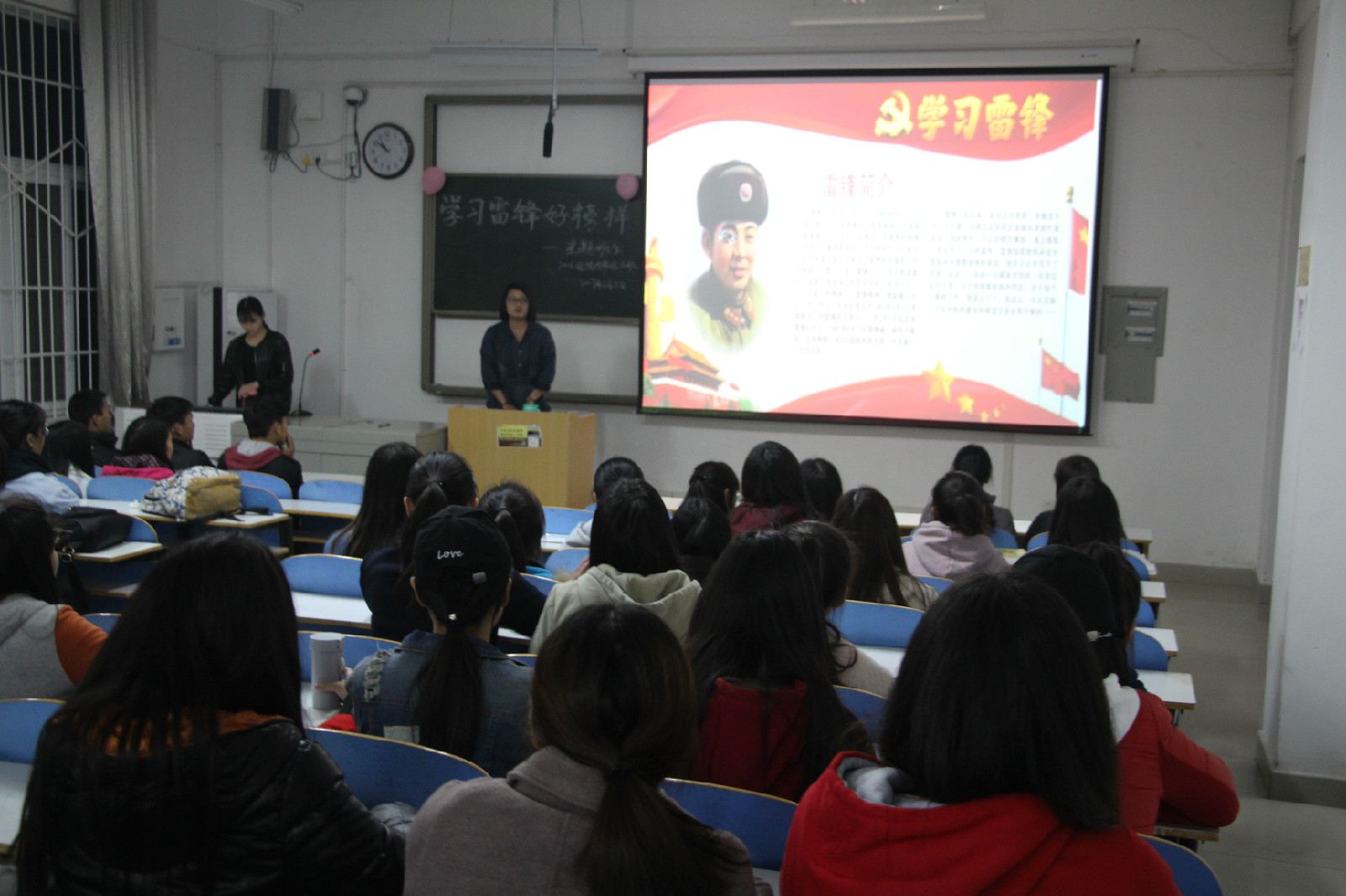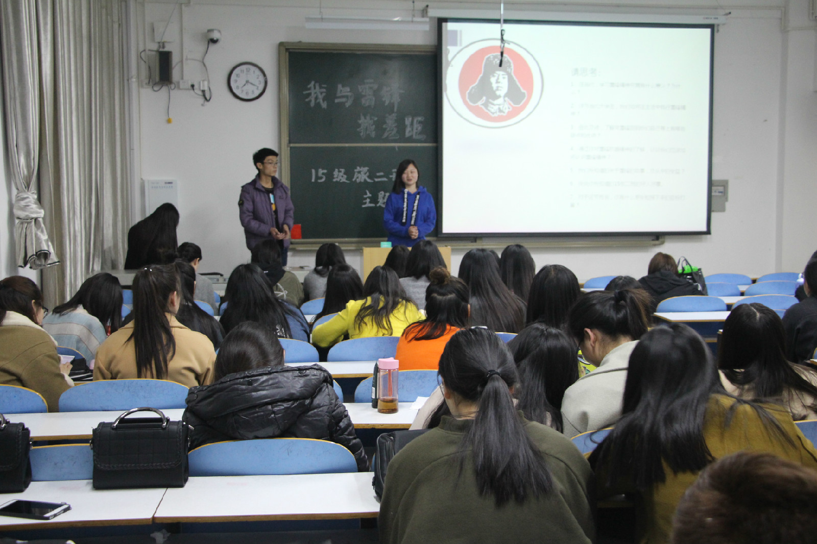 各班级以“我与雷锋找差距”为题开展主题班会。班会结合了播放视频和PPT介绍雷锋生平光荣事迹,聆听歌曲“学习雷锋好榜样”,探讨雷锋精神的实质等方式开展。鼓励学子用实际行动倡导发扬雷锋精神,并为同学们提出三点方向:一、弘扬雷锋精神,带头模范表率;二、实践雷锋精神,志愿服务人民;三、时代需要雷锋精神,雷锋精神与时俱进。此次班会在各个班级激烈的掌声中圆满落幕。