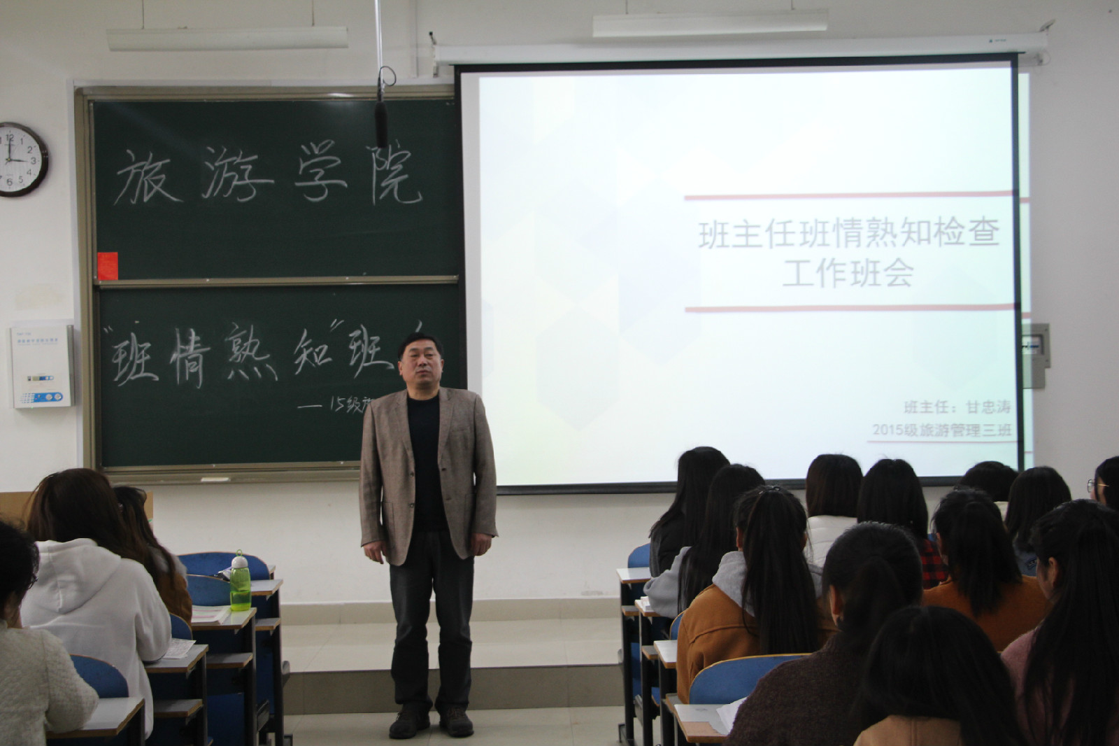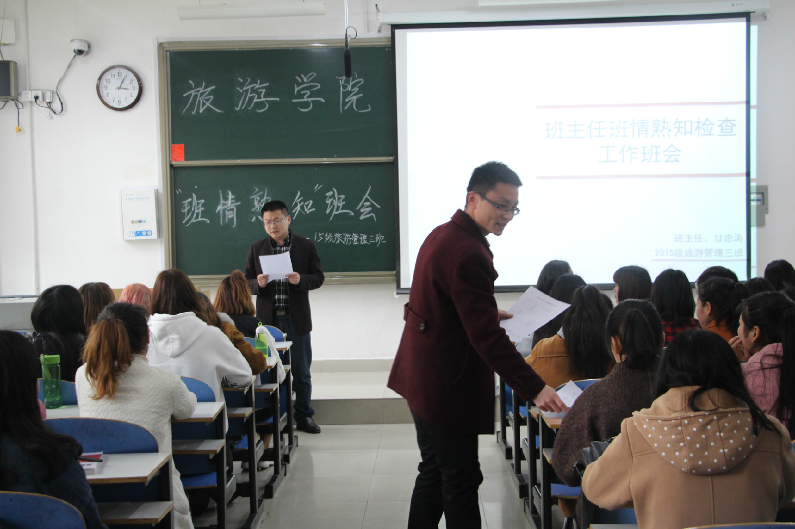 为响应员工处下发的《关于开展辅导员(班主任)班情熟知检查工作的通知》,3月17日下午,2015级旅游管理三班班情熟知检查工作主题班会在经管楼202教室顺利召开。员工处副处长严彬,管理科科长黄树余及公司党委书记曹明贵,副书记张晓峰携全体辅导员参加班会。