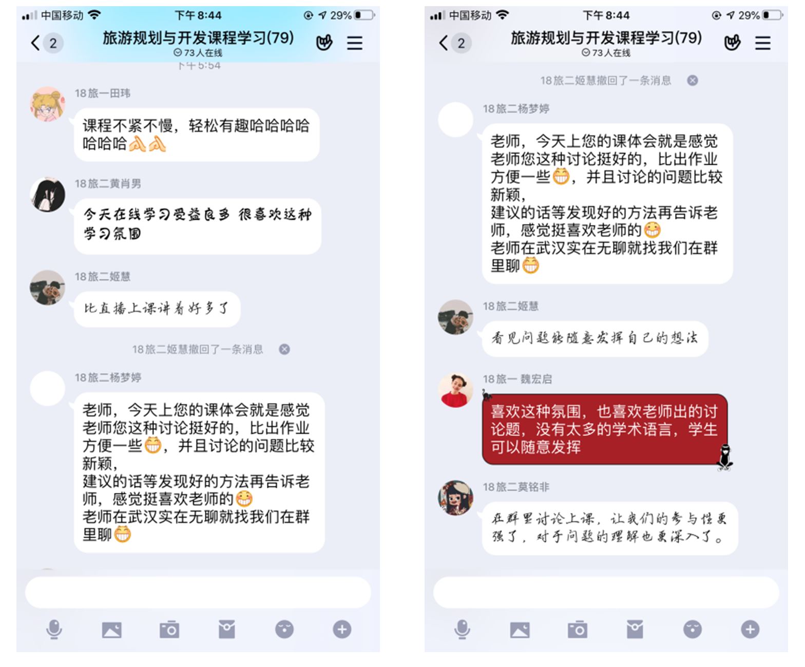2018级旅游管理二班田玮同学在上《旅游规划与开发课程》说:“课程不紧不慢,轻松有趣。”同班的黄肖男同学认为,在线学习受益良多,很喜欢这种学习氛围。