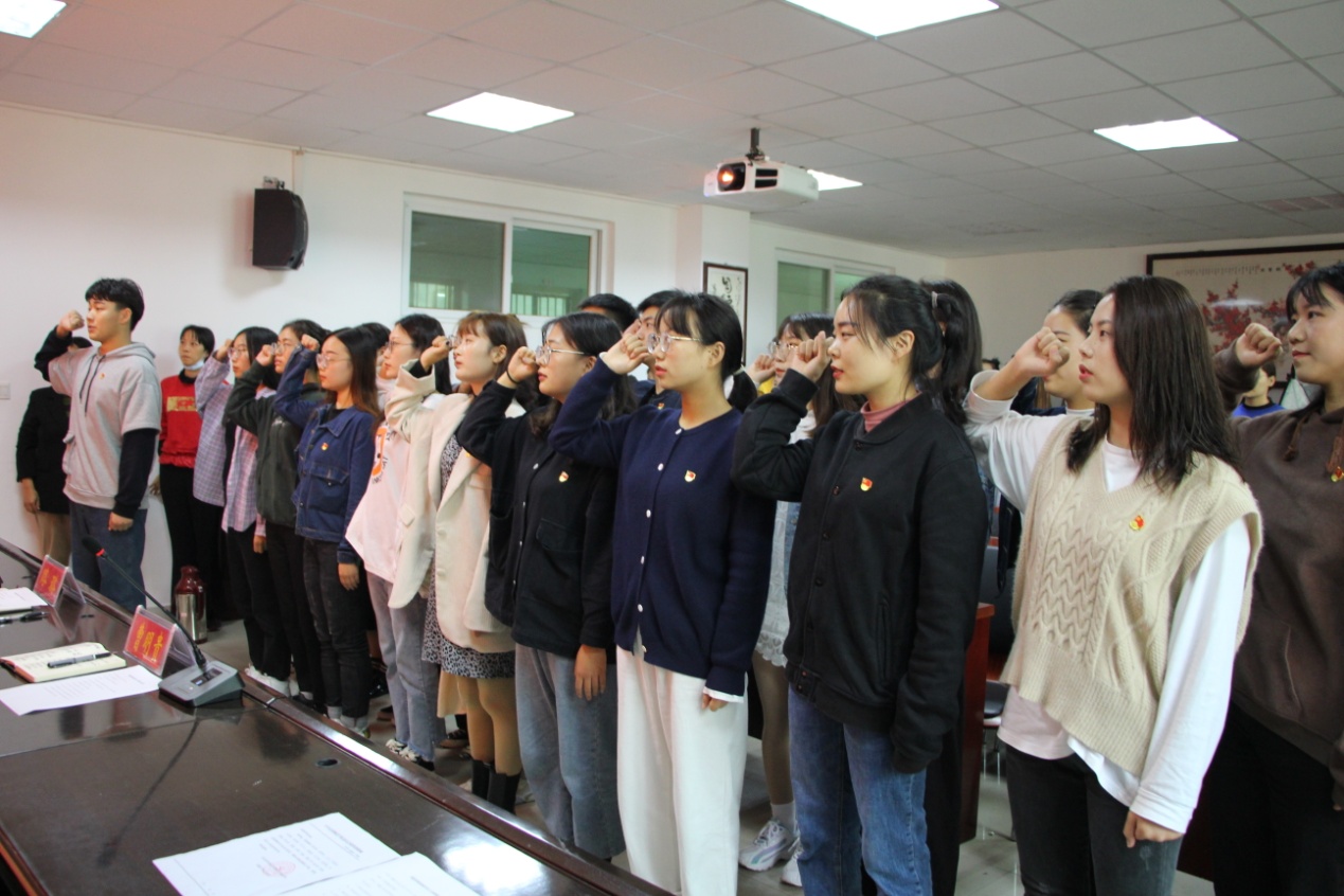 大会在庄严的《国际歌》中拉开序幕,首先,闫会姝和郑征分别宣读了接收预备党员便函和预备党员转正便函。接着,二十名预备党员面对鲜红的党旗庄重宣誓。2017级正式党员代表党玉格、2017级预备党员代表张文静和2019级入党积极分子苗新沛分别做了表态发言。