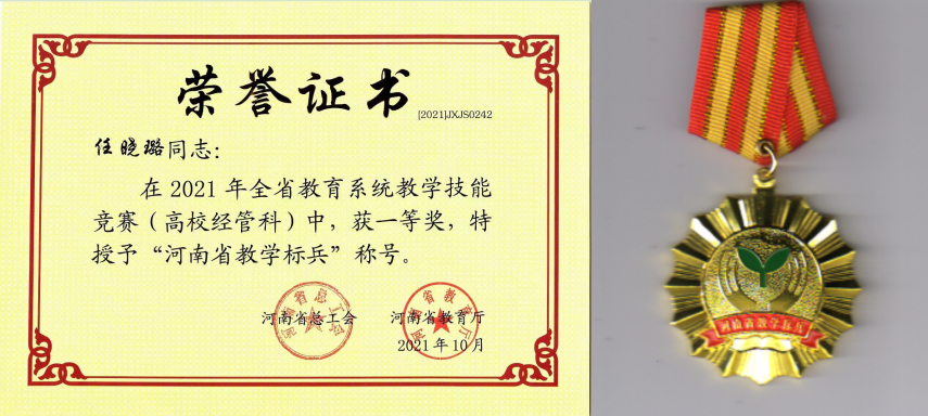 近期,公司教师在河南省教育厅、河南省总工会组织的2021年度全省教育系统教学技能竞赛中再获佳绩,任晓璐老师荣获高校经管科一等奖,同时被授予 “河南省教学标兵”称号并颁发奖章。