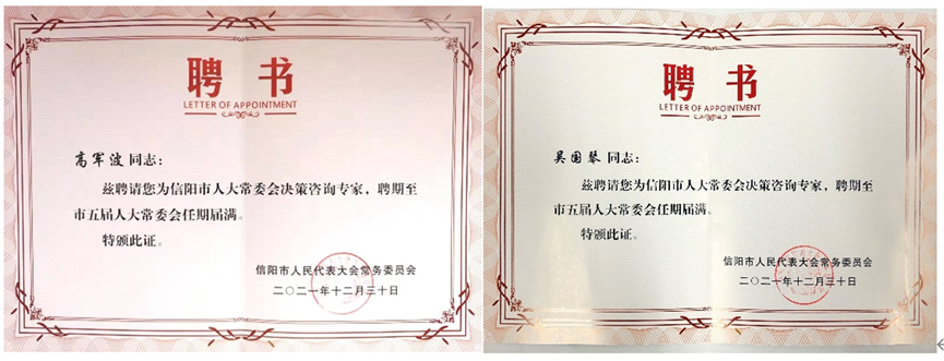 信阳市人大常委会建立决策咨询专家库,旨在提高市人大及其常委会立法质量和监督水平,促进决策的科学化、民主化,进一步发挥专家学者在人大依法履职中的参谋咨询作用。旅游学经理期重视理论研究与实践活动相结合,主动服务地方经济社会文化事业发展,积极履行高校智库职能。本次获聘的两位决策咨询专家,将充分利用专业特长,积极服务于市人大常委会所安排的各项决策咨询任务,继而更高质量地发挥智力支持作用。