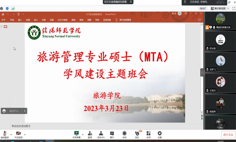 会上,李明伟重点围绕公司春季学期研究生学风、校风建设相关要求,结合公司旅游管理专业硕士(MTA)培养的实际情况展开讲解。他指出目前校园逐渐恢复常态化管理,全体同学应尽快适应线下学习要求,上好每一节课;要遵守校规校纪和各项规章制度,严格履行好因病因事及外出请假手续;要提高安全防范意识,注意外出交通安全,管理好自身财物,谨防电信诈骗;要提升文明素养,在公共场所行为举止规范得体,遵守校园交通规则;要结合公司MTA培养流程,做好在校期间的学习规划,遵守《研究生日常管理规定》;加强与导师的交流和沟通,积极融入导师科研团队,推动学业稳步前进。