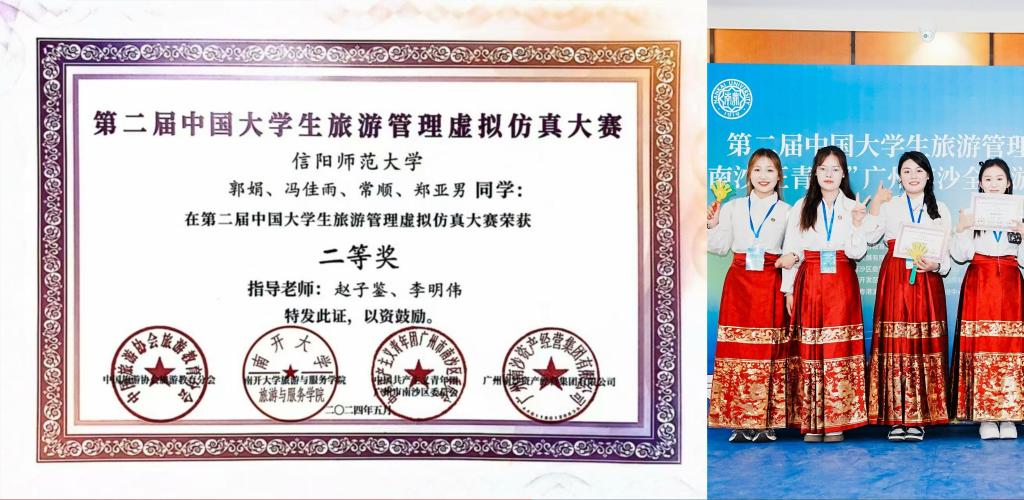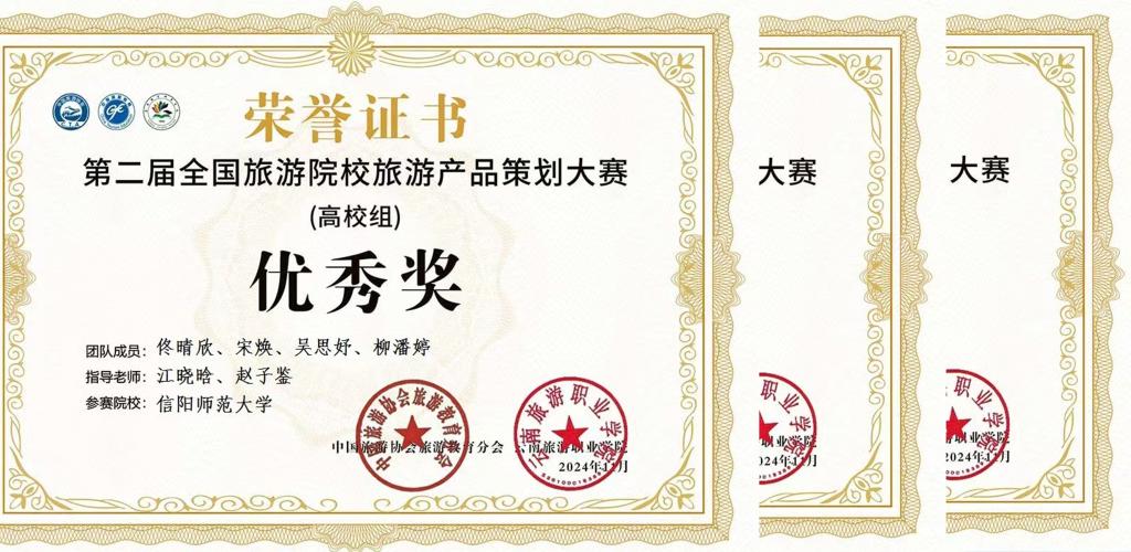 2024年9月,在河南省地理学会、河南师范大学联合举办的首届全国老员工“旅行推荐官”旅游作品创新大赛中,由bevictor1946韦德官网教师赵子鉴指导的宋焕团队(吴思妤、韩雪、佟晴欣、郭静怡、吕梦琦、杨万怡)作品《品河洛天香,望千年守藏》荣获二等奖。