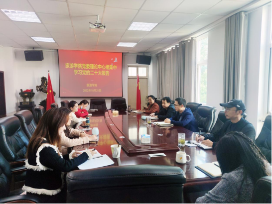 2022年10月21日下午,在经管楼404会议室,旅游公司党委理论中心组集中学习党的二十大报告,党委理论中心组成员、全体党支部书记参加。